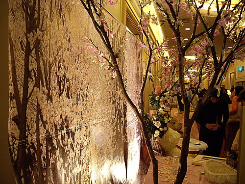 這對新人還製作了婚禮小物喔!很特別,不同於以往的金莎花和小熊,或是磁鐵...等,這對新人準備的是2008年的桌上型年曆,每一個月份都是自己的婚紗照,還有幾張MEMO和收支表,以3.5磁片裝納,感覺還不賴,是一個很有心也很實用的謝禮喔 今天是好日子,旁邊的場地也都爆滿,還有一場是地方望族,不只有一群人上台致詞,還掛滿了政府官員致禮的布幔,甚至請的樂團是屬於鄉土風,竟然連”神鵰俠女”這首歌都成了演唱的歌曲。 另外有一場特地安排了照相區喔,是很有日式風格的櫻花佈置,新人就站在這前面向賓客致謝,合照出來的氣氛也多了日本風,大家可以欣賞一下喔 後來經理看到我,直接跟我說:大材小用哩!原來他說的是我主持十桌,根本就大材小用,哈!其實我很珍惜每一場的經驗,因為都會帶給我不同的感觸。也可以感受到每ㄧ對新人的甜蜜和幸福,這是我最開心的事情哩!