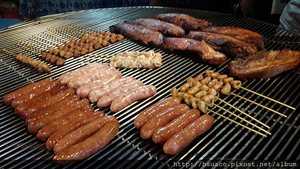 吃完海鮮,嗜肉的ACO怎麼可能就滿足,這回來到睡搖籃的烤肉攤,看到排排站好的山豬肉.香腸.七里香