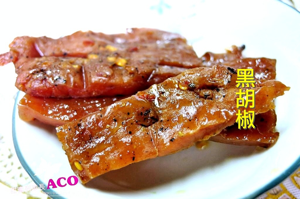 不同於一般肉乾的甘甜醬汁,加入黑胡椒的迷人香氣,再加上一些辣度