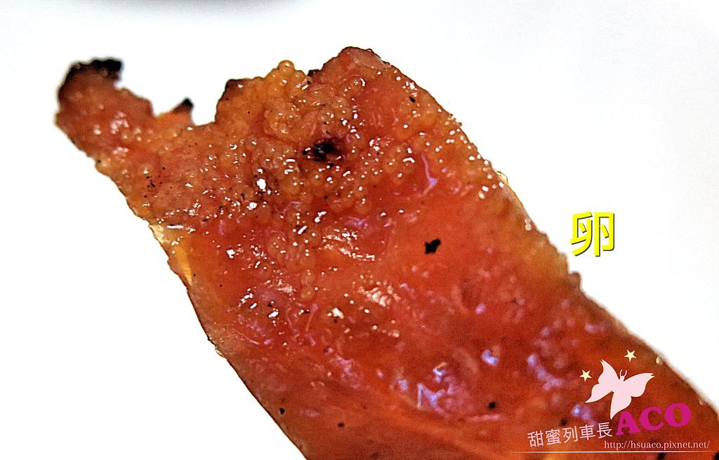 在肉乾上有著滿佈的小小顆魚卵,可以感受到魚卵咬開時的逼逼波波