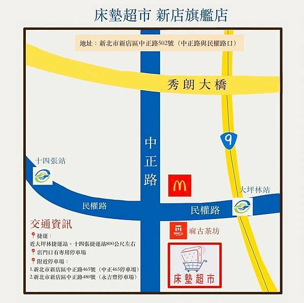 新北床墊超市新店旗艦店就位於新店中正路上,鄰近民權路的交叉口