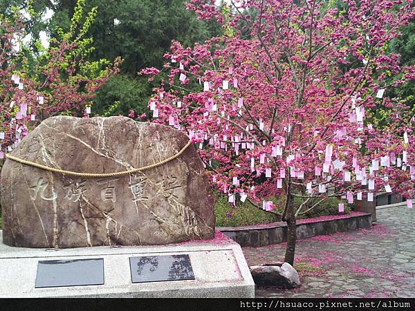 這兒的大石塊註明著"九族百重櫻",在這賞櫻名所認證碑旁,也安排了幸福守護御守