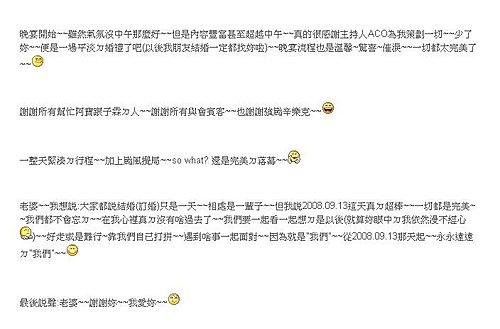 晚宴開始雖然氣氛沒中午那麼好但是內容豐富甚至超越中午真的很感謝主持人ACO為我策劃一切少了妳便是一場平淡ㄉ婚禮了吧(以後我朋友結婚一定都找妳啦)晚宴流程也是溫馨驚喜催淚一切都太完美了